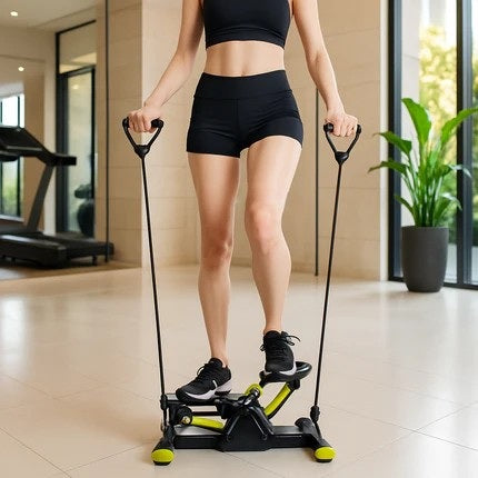 Le Sports Stepper ne se contente pas de faire travailler vos jambes. Il sollicite simultanément vos pieds, jambes, hanches, taille et même vos bras grâce aux élastiques de résistance inclus.